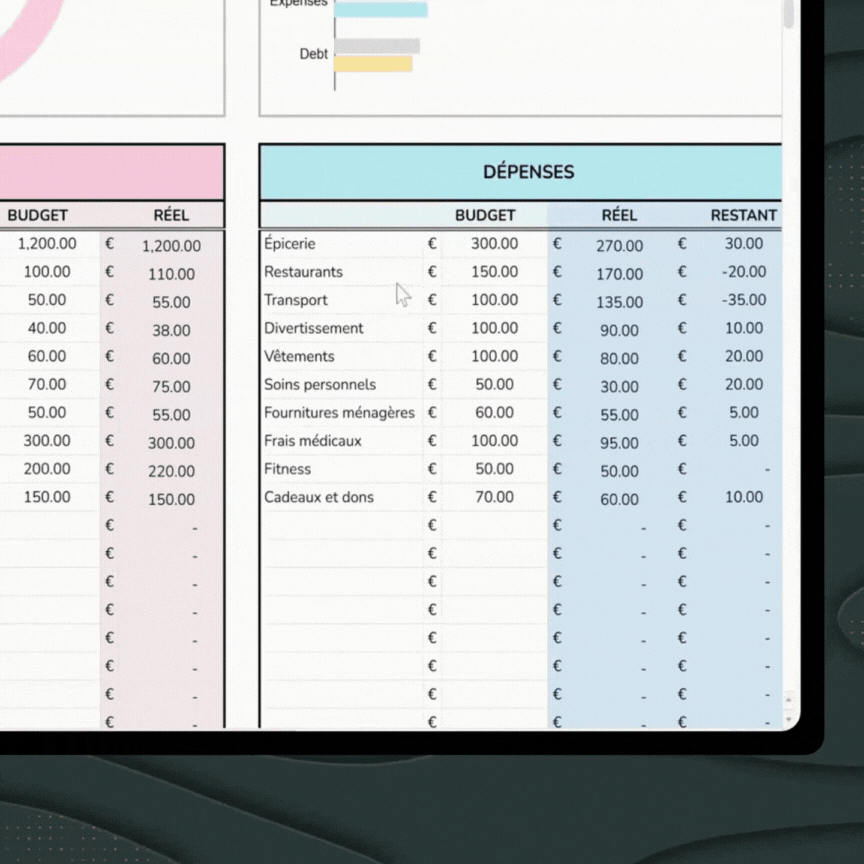 Profitez de notre fonctionnalité pour budgéter votre mois et définir ce que vous souhaitez avoir comme épargnes, dépenses, dettes, revenus et pouvoir suivre avec précision votre évolution.